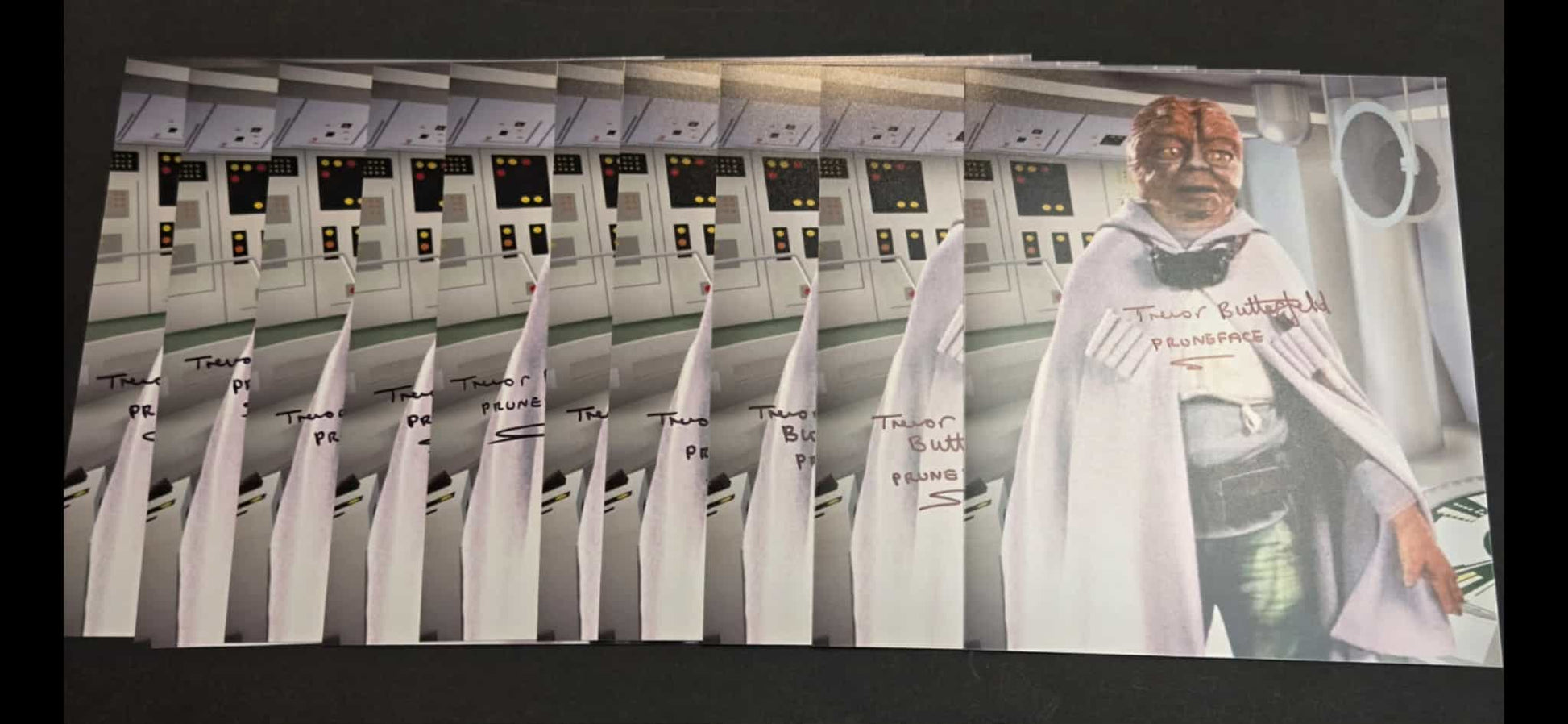 Here's your chance to grab an Authentic SIGNED Star Wars Prune Face 8x10! This item was HAND-SIGNED in black Sharpie marker by Actor TREVOR BUTTERFIELD (Pruce Face in Star Wars Episode VI: Return of the Jedi)! This Prune Face 8x10 was signed at our September 2025 IntergalactiCON at Hobart and William Smith Colleges in Geneva, NY and will come in a top loader and soft protective sleeve.
